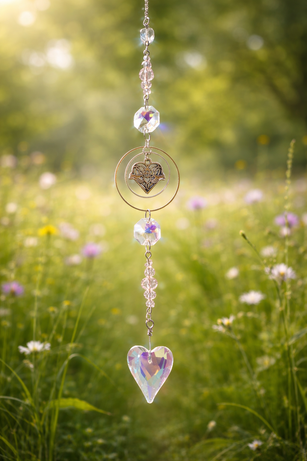 Suspendu près d’une fenêtre, ce bijou décoratif crée une atmosphère douce, lumineuse et apaisante. Son pendentif en forme de cœur symbolise l’amour, la tendresse et l’harmonie, tandis que les perles facettées amplifient la lumière et apportent une touche de raffinement.